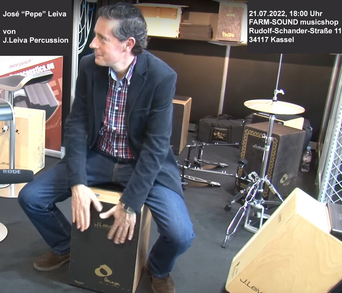 DONNERSTAG, 21. JULI 2022 VON 18:00 BIS 21:00 J.Leiva Masterclass Cajon-WorkshopFARM-SOUND präsentiert: Master Class Cajon-Workshop mit José „Pepe“ Leiva von: J.Leiva Percussion S.L. 21.07.2022, 18:00 Inhalte: 1. Einleitung • Grundlagen der Cajón • Erklärung und Spielen einiger Flamenco-Basis-Rhythmen 2. Geschichte der Flamenco Cajón. Wie funktioniert eine Flamenco Cajón • Erläuterungen zu: Geschichte der Marke, Philosophie, Arbeitsweise. • Holzworkshop: So funktioniert eine J.Leiva Cajón. (Montage, Innenausstattung, Sound, Frontplatte…) • Cajón-Wartung, Saitenwechsel, neue J.Leiva-Systeme und Vorteile in der Cajón-Welt 3. Feedback-Zeit: • Pepe Leiva beantwortet alle Fragen, der Teilnehmer • Kleine Reparaturen an den Cajons der Teilnehmer sind möglich. • Fachgespräche in entspannter Atmosphäre. Dauer ca. 3 Stunden! Veranstaltungsort: FARM-SOUND-Drumabteilung Gern die eigene Cajon mitbringen! Eintritt frei. Bitte kündigt Euer Kommen mit einer kurzen E-Mail an „laden@farm-sound.de“ an.